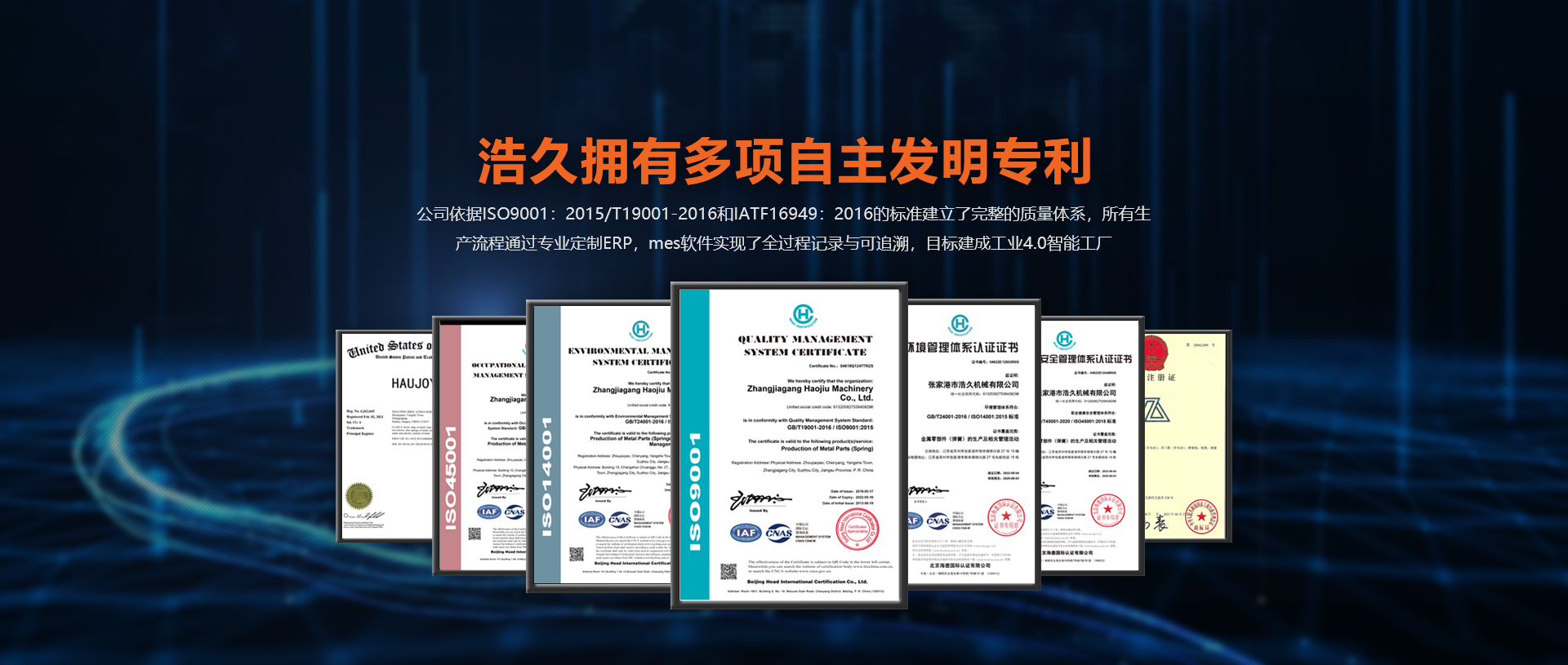浩久擁有多項(xiàng)自主發(fā)明專(zhuān)利。公司依據(jù)ISO9001GB/T19001-2016和IATF:2016的標(biāo)準(zhǔn)建立了完整的質(zhì)量體系,所有生產(chǎn)流程通過(guò)專(zhuān)業(yè)定制ERP,mes軟件實(shí)現(xiàn)了全過(guò)程記錄與可追溯,目標(biāo)建成工業(yè)4.0智能工廠。